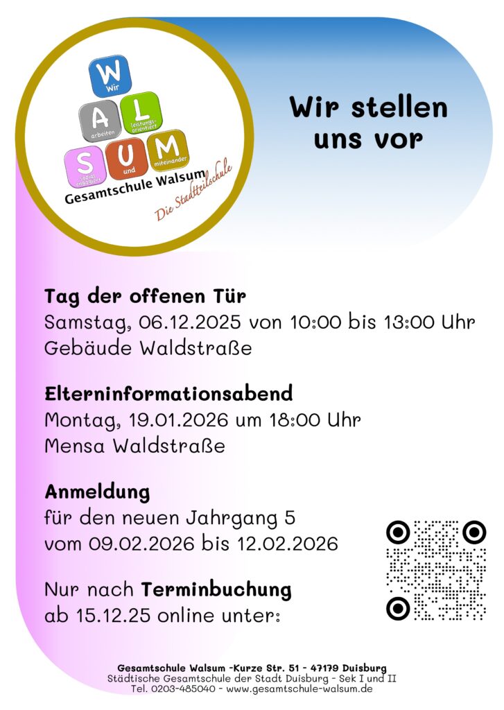 9. Oktober 20259. Oktober 2025 webmaster Anmeldung und Termine neuer Jahrgang 5 Die Gesamtschule Walsum stellt sich vor! Bitte beachten Sie, dass eine Anmeldung nur nach vorheriger Terminbuchung erfolgen kann.