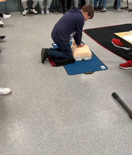 In der Praxis bekamen die Siebtklässler eine klare Botschaft: Prüfen – Rufen – Drücken – so einfach es klingt, so anspruchsvoll ist es in der Praxis. Und es gibt ein Hilfsmittel: Die rhythmische Begleitung zu Melodien von „Atemlos durch die Nacht“ oder „Stayin‘ alive“ unterstützen die korrekten Abläufe beim Drücken.